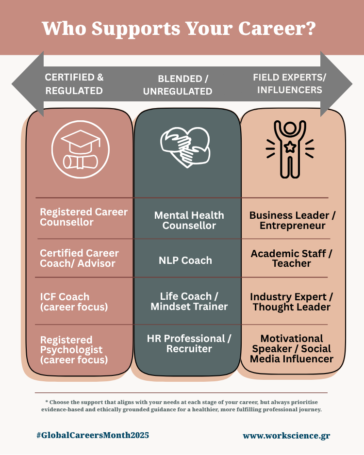 In today’s complex and rapidly changing world of work, individuals are increasingly seeking support for career decisions, job transitions, and professional growth. The field of career guidance has expanded far beyond the classic “career counsellor,” now encompassing a wide variety of practitioners—including career coaches, mindset trainers, life coaches, mental health counselors, and, most recently, industry experts and social media influencers who share advice online.